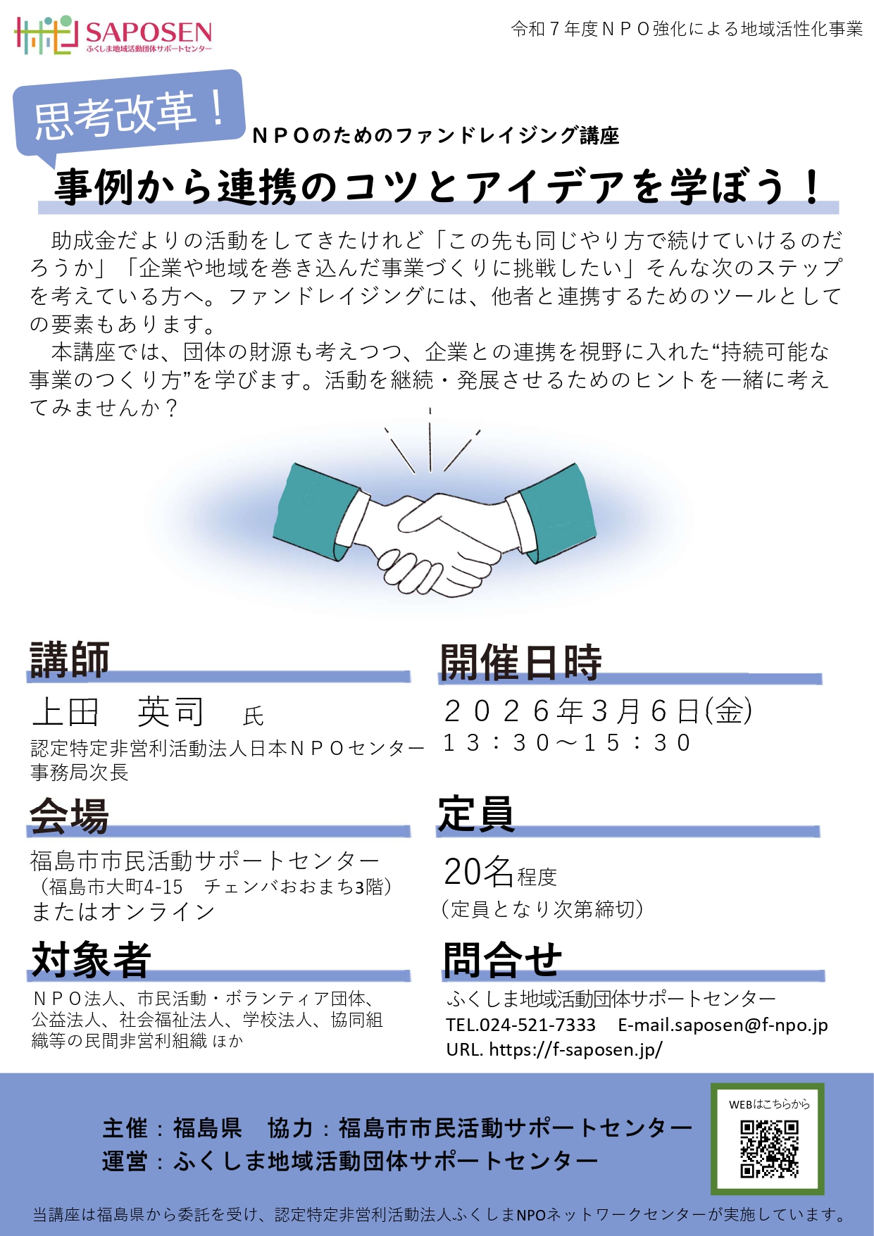 ※この講座は福島県から委託を受けて認定特定非営利活動法人ふくしまNPOネットワークセンターが実施しています。